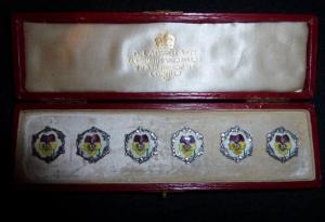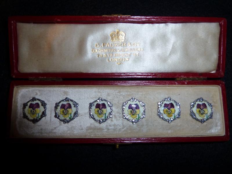 Pictured is a delightful boxed set of sterling silver Pansy buttons with enamel decoration.